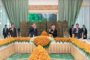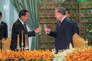 នៅរាត្រី ថ្ងៃសុក្រ ៧កើត ខែអាសាឍ ឆ្នាំរោង ឆស័ក ព.ស. ២៥៦៨ ត្រូវនឹង ថ្ងៃទី១២ ខែកក្កដា ឆ្នាំ២០២៤ សម្ដេចអគ្គមហាសេនាបតីតេជោ ហ៊ុន សែន ប្រធានព្រឹទ្ធសភា នៃព្រះរាជាណាចក្រកម្ពុជា អញ្ជើញដង្ហែ ព្រះករុណា ព្រះបាទសម្ដេច ព្រះបរមនាថ នរោត្តម សីហមុនី ព្រះមហាក្សត្រ នៃព្រះរាជាណាចក្រកម្ពុជា ក្នុងពិធីលៀងសាយភោជន៍ ជូនឯកឧត្តម តូ ឡឹម (TO Lam) ប្រធានរដ្ឋ នៃសាធារណរដ្ឋសង្គមនិយមវៀតណាម នៅព្រះបរមរាជវាំង ក្នុងឱកាសដែលឯកឧត្តមអញ្ជើញបំពេញទស្សនកិច្ចផ្លូវរដ្ឋនៅព្រះរាជាណាចក្រកម្ពុជារយៈពេល២ថ្ងៃ ចាប់ពីថ្ងៃទី១២ ដល់ថ្ងៃទី១៣ ខែកក្កដា ឆ្នាំ២០២៤។